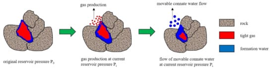 During the exploitation of the tight gas reservoir, as pore fluids are extracted, the reservoir pressure decreases, leading to an increase in effective stress within the rock framework, resulting in deformation. Rock deformation includes changes in both rock framework volume and pore volume. However, the volume changes in the rock framework are exceedingly small and negligible. Consequently, the total rock volume is considered constant throughout the development process. The deformation induced by increased effective stress primarily affects the pore volume. Furthermore, during the depressurization extraction process, pore-dead-end water influenced by pore structure and bound water governed by pore surface chemistry cannot be produced. Therefore, the saturation of absolute connate water in a tight reservoir remains unchanged.