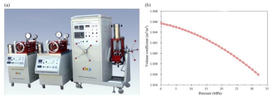 Formation water volume coefficient tests. (a) Formation fluid PVT instrument. (b) Volume coefficient of formation water at different pressures and 90 °C.