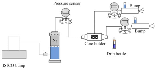 Figure 6 shows the experimental setup for determining the volume coefficient of formation water. The experimental procedure mainly consisted of the following steps: (1) Saturation of the dry rock cores with formation water, followed by placement into the core holder. (2) Injection of constant pressure N2 to displace formation water in the rock cores. The water saturation of the rock cores at this pressure was calculated after weighing them when the formation water volume in the drip bottle remained constant. (3) Incremental pressure adjustments with N2 and the repetition of the previous steps.