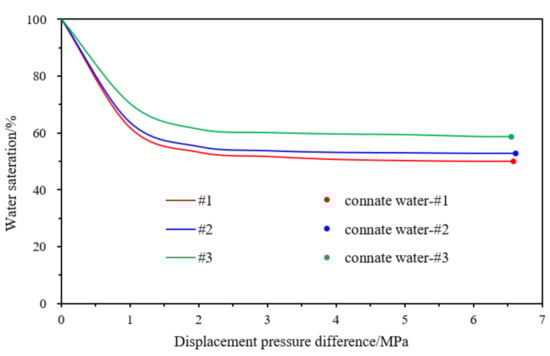 The variation of water saturation in different rock cores with displacement pressure differences is shown in Figure 8. The experimental results show that in the low displacement pressure difference stage, as the displacement pressure difference increases, the gas flow rate increases, more water molecules flow out of the pores, and the water saturation decreases. The formation water extracted during this stage is film water, which is also the main source of water production in the initial production stage of the gas field. When the easily flowing film water is completely extracted, continuing to increase the displacement pressure difference (when the displacement pressure difference is greater than 5 MPa), the adsorbed water on the surface of the particles and the water at the corners and blind ends of the pores are difficult to flow, and the water saturation of the rock core remains basically unchanged. This is the connate water saturation under the original in situ stress conditions. Furthermore, it is noteworthy that higher pore permeability correlates with lower connate water saturation under the original in-situ stress conditions, with the connate water saturation within this block typically ranging from 52% to 58%.