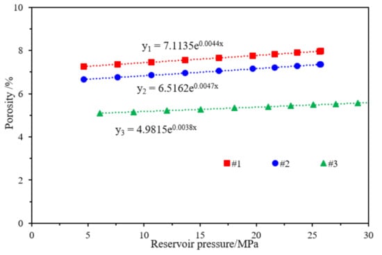 Figure 9 displays the changes in rock porosities with reservoir pressure variations. The experimental results indicate that porosity decreases with a decrease in reservoir pressure. This phenomenon occurs due to the increase in effective stress within the reservoir during gas production, resulting in the compression of the rock skeleton and a decrease in porosity. We have compared the accuracy of different functions to fit the relationship between porosity and reservoir pressure and find that the exponential correlation has the highest accuracy (R2 = 0.99). Hence, we employ an exponential relationship to fit the curve depicting the relationship between porosity and pressure, as follows: