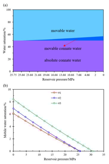 Based on the experimental results of connate water saturation (Figure 8) and porosity stress sensitivity (Figure 9), in conjunction with Equations (3) and (4), we calculated the dynamic variation of water saturation in different stratigraphic cores during the development process, as depicted in Figure 10a. The graphs clearly demonstrate that connate water saturation increases as reservoir pressure decreases. Taking core 1 as an example, as reservoir pressure decreases from 25 MPa to 10 MPa, connate water saturation increases from 3% to 5%, with an increment of 2%. This increment represents the proportion of connate water transitioning into movable water, referred to as movable connate water saturation. During the pressure reduction, core 1 reaches a maximum movable connate water saturation of 5%. Therefore, the dynamic variation of reservoir connate water saturation during development should not be neglected, as it constitutes a primary reason for the lack of water production in the early stages of gas reservoirs and the subsequent significant water production in the later stages.