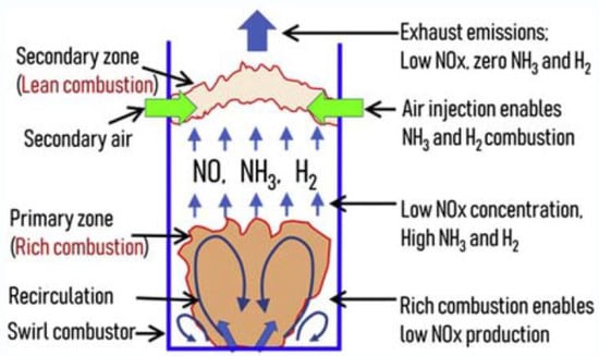 | Rich-quick-lean-graded combustion | NH3-Air | 31.4 kW | φ = 1.1, NOx min: 42 ppm | Reduce thermal and fuel NOx emissions | [144] | |
