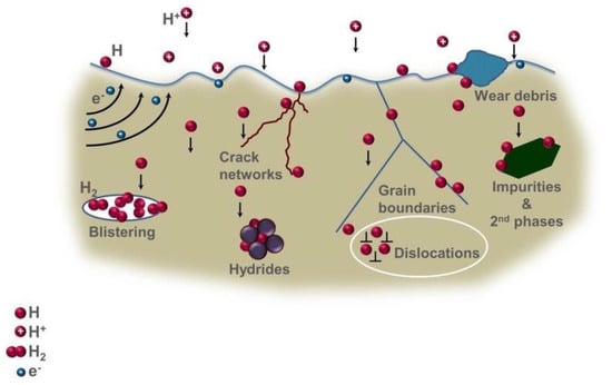 - Hydrogen embrittlement can occur through different mechanisms, including stress corrosion cracking, hydrogen-induced cracking, or hydrogen embrittlement [188]. The diffusion of hydrogen atoms into a metal can make it more brittle and prone to cracking. This process can cause various metals, especially high-strength steel, to become brittle and fracture following exposure to hydrogen [187].