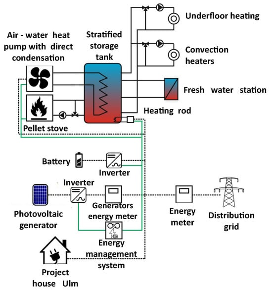 The Projekthaus Ulm (PHU) is a low-energy house inhabited by a family of four. The house is equipped with a 9 kWp and a 4 kWp PV system and a 4 kWh battery storage. The core of the heating system consists of a 14 kW air-to-water heat pump and an 800 L thermal stratified storage tank with a max. 6 kW heating rod. Bivalent operation is made possible by a supplementary pellet burner, which is used primarily during periods of low outdoor temperatures when the efficiency of the heat pump drops []. The system allows for heating via underfloor heating and conventional radiators, as well as hot water delivery via a freshwater station. Due to the fact that the heat storage reaches a temperature of over 60 °C during operation, the requirements according to DVGW worksheet W 551 in combination with the German Drinking Water Ordinance are fulfilled, and as the usable hot water is not delivered directly from the thermal storage, further disinfection is not included in the modeling and analysis. A schematic of the installed heating and electric system is shown in Figure 1.