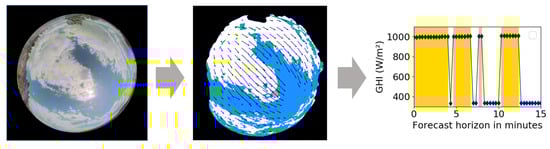 In the ASI-based nowcasting system, irradiance forecasts are calculated in a step-by-step physically based approach. A detailed description of the nowcasting system can be found in [,]. A fisheye camera takes pictures of the whole sky every 10 s. The first step of the forecasting algorithm is calculating a cloud mask using the image pixel values as inputs. Every pixel is classified as cloud or clear sky. The cloud movement is then calculated using an optical flow algorithm. The resulting motion field is applied in the next step to the cloud mask using inverse mapping to retrieve a forecasted cloud mask. From the forecasted cloud mask, a binary time series of shadow is extracted for the pixel of the sun position in the image, which is the position that shades the camera. This time series of shadow and recent irradiance measurements are used as input for a statistical model that calculates an irradiance forecast. Figure 2 illustrates the main steps from images of the sky to an irradiance forecast.
