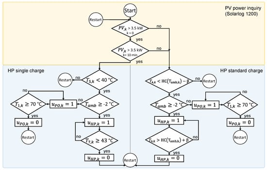 A special challenge in the implementation of the original and also the here-presented improved heuristic controller is that the heat pump has a controller that controls the internal components, like compressor, valves, pumps, etc. This internal controller does not initially allow the desired single charge. Therefore, the control implemented in the heat pump, which is based on a predetermined heating curve and dead zone controls (hysteresis), must be “tricked” by the predictive controller by appropriately faking appropriate temperature input data, which results in the heat pump turning on and off and allows for a single charge.