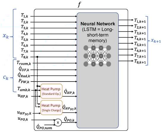 In modeling the heating system, no physical equations were used or the parameters of classical system models identified, so no explicit expressions for the function f are available. Instead, a hybrid model was used here that combines a neural network for the dynamics of the stratified storage tank and direct condensation with a regression model for the heat flow of the heat pump. The reason for this data-based approach was that the authors could not achieve sufficient model quality with the classical modeling approaches, probably due to the particular complexity of the combination of direct condensation and stratified storage.