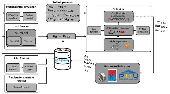 Therefore, in our case study, an innovative cloud camera-based combined forecast was used for PV forecasting. Machine-learning-based solutions were used to forecast the electrical and thermal loads. A challenge was often also the clean acquisition of data during operation. In the case study, for example, we had to work with electrical signals from the fresh water pump contaminated by electric couplings, which first had to be cleaned up using machine learning methods before they could be used. For details, refer to []. Figure 5 shows the architecture of the practical implementation of the control system in the Projekthaus Ulm.