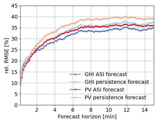 We present the results of the ASI-based forecasts of GHI and PV power from the Projekthaus for a data set containing May and June 2019. Figure 6 shows the relative Root Mean Square Error (RMSE) of the GHI and the PV power forecast. The RMSE is calculated from the forecasts and the corresponding measurement ,