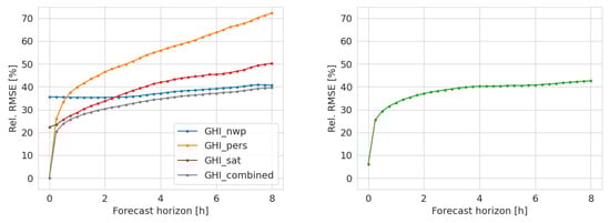 For evaluation of intraday forecasting, we show results for a period from May to August 2019. The left panel of Figure 7 shows a comparison of the performance in terms of RMSE for the different input irradiance forecasts and the optimized combination forecast depending on the forecast horizon, up to 8 h. The persistence forecast (orange line) performs well for small horizons up to about 15 min, the satellite forecast (red line) performs best for intermediate horizons up to about 2.5 h, and the NWP (blue line) performs best for large horizons of several hours. The performance of the optimized combination forecast obtained from the linear regression model is given in gray. As expected, the combination forecast always exhibits a lower RMSE than any of the individual input forecasts. The performance (also in terms of RMSE) of the PV power forecast, which is obtained after applying a PV simulation to the combination forecast, is shown in the right panel of Figure 7. As for the ASI-based forecast, the intraday PV power forecast also has a slightly higher RMSE than the intraday irradiance forecast due the additional modeling step.