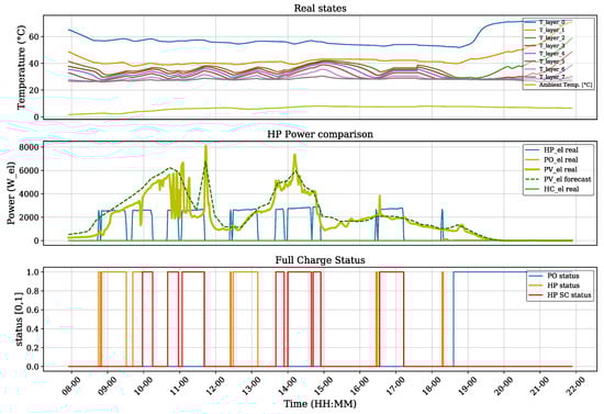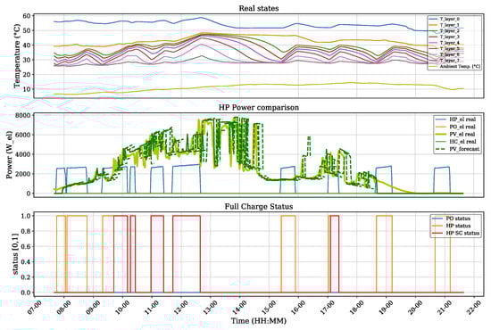 In this test, the model predictive control was driven with a 5 min time interval, and an intraday forecasting system was used for the predictions. The intraday forecast combines weather and solar predictions and provides data with a horizon of a day. The results are shown in Figure 9.