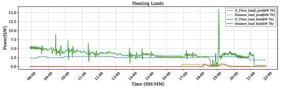 At around 10:15 h, the single charge operation that was conducted previously by the predictive controller was stopped early. Without this stop, the tank could have been heated further, as no temperature limits were reached and enough PV power was still produced, thus avoiding the operation afterwards (around 10:40 h) where intermittent PV power was produced. This behavior can be attributed to three main factors, i.e., (i) the deviation between the predicted PV power and the real produced power, where no intermittent PV production was expected (as seen in the PV prediction); (ii) the error between the hybrid model and the real behavior of the storage tank, causing a change in the optimizer’s decision during the given control calculation; and (iii) the deviation in the load prediction models, where the optimizer might have calculated a different result for the given schedule with the calculated a expected heating load. However, these deviations show the ability of the predictive controller to respond to changing conditions, where it was able to provide the necessary heat to meet the given demand while maximizing the available PV power even when conditions were not optimal.