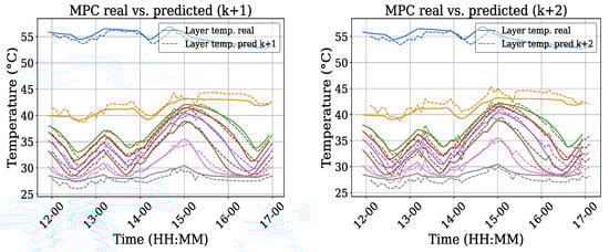 This combination of different models, forecast methods, and input sources proved to work successfully in the test environment. Figure 11 shows the measured system states versus predicted system states during MPC operation with a mean absolute percentage error (MAPE) of 1.68% and 2.60%, respectively, showing, in this case, a good prediction for the predictive controller. The predictions for the thermal loads during the day and the PV power, showed an MAPE of 44.2% and 39.7%, respectively. The difference can be seen in Figure 10. This difference is directly attributed to the models, and the sampling used.