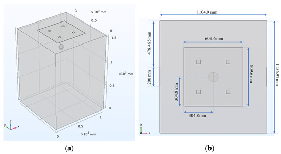 Figure 1 shows the 3D model of the system created in COMSOL. The system comprises a rectangular test chamber with dimensions of 1104 mm × 1157 mm × 1562 mm, featuring a ceiling panel positioned at the center of the ceiling.