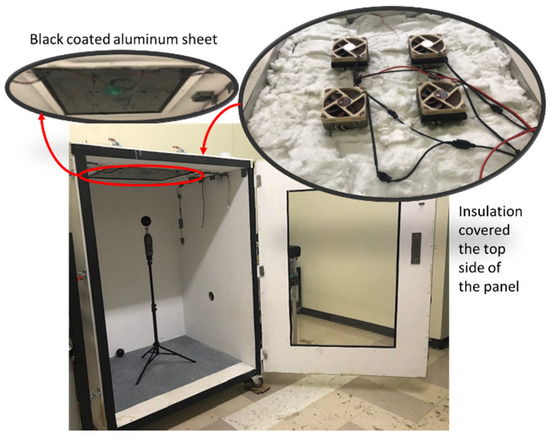 An experimental setup was developed to investigate the feasibility of a TE-based radiant ceiling panel and validate the numerical model introduced in this article. Figure 2 displays the test chamber that was built and used to test the TE-based radiant ceiling panel. The panel is integrated at the chamber’s ceiling center. Similar to the numerical model, the ceiling panel is constructed from a 609.6 × 609.6 mm2 aluminum sheet with a thickness of 2 mm, fastened to the ceiling. Four TE modules are attached on top of the ceiling panel 10 cm from the edges. The optimal number of TE modules has been determined in previous research papers [52]. To manage heat dissipation from the TE modules, each module is equipped with an air-cooled heatsink. The remaining portion of the radiant ceiling panel’s upper surface is covered with ceramic fiber insulation material.