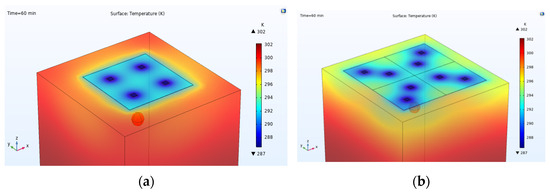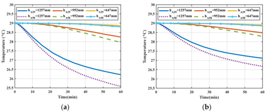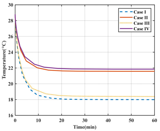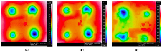 Figure 4 illustrates the change in the ceiling panel temperature with time for the four cases that were studied. In each case, the ceiling panel’s temperature achieves a steady-state condition within 15 min. For each setpoint for the TE temperature, the decrease in temperature resulting from expanding the panel’s surface area is smaller than one degree. Given the size of the chamber and the panel, that result is expected. Comparable findings were also observed by Chiang et al. [21].