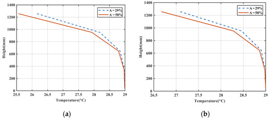 Vertical temperature distribution at different heights: (a) Tc = 13.5 °C, (b) Tc = 18.5 °C.