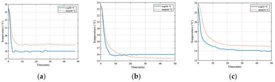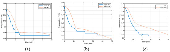 As shown in Table 6, a total of three cases are examined in this study to validate the findings. The experiments involve measuring the transient variation of the ceiling temperature in steady-state conditions under three different circumstances, as shown in Table 7. The TE modules are supplied with a specific input current and voltage to lead the radiant ceiling panel temperature to settle at 18 °C, 16 °C, and 14 °C in cases 1, 2, and 3, respectively.
