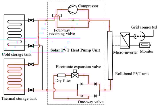 A PVT heat pump integrated with the refrigerant-based PVT unit is proposed based on earlier research on the photovoltaic thermal comprehensive utilization technology and the direct expansion solar heat pump (DX-SHP) technology is shown in Figure 1. Photovoltaic cells were added to the refrigerant-based solar collector surface, which worked an evaporator and a converter of solar radiation into electricity. Through the employment of a four-way reversing valve system, the roll-bond unit operated as the condenser throughout the summer to create space cooling and facilitate the changeover from the heat pump cycle to the refrigeration cycle. A substantial amount of thermal energy was accumulated on the solar panels throughout the photovoltaic effect process, which drastically reduced the PV efficiency. The refrigerant utilized as the working fluid in the solar PVT heat pump system, however, is able to absorb the thermal energy produced independently with the photovoltaic panels. The lower-grade heat source of the heat pump system might be the absorbed energy along with the solar radiative energy and the convective thermal energy with air. In order to considerably increase the overall usage of energy efficiency, the PV panel surface temperature was lowered while power generation performance was enhanced. In the authors’ previous study, a roll-bond photovoltaic thermal heat pump multi-energy generation system was proposed [34,35].