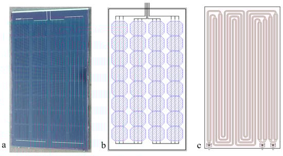 RB-PVT unit. (a) Real picture, (b) PV module, and (c) Refrigerant flow path of roll-bond heat exchanger.