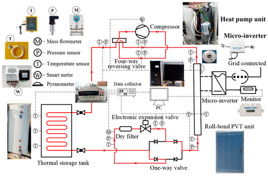 The monitoring system recorded data on compressor power consumption, PV power generation, temperature, pressure, and external meteorological conditions. Real-time outdoor meteorological data were monitored using the PC-4 meteorological environment monitoring system (purchased from Jinzhou Sunshine weather technology Co., Ltd., Jinzhou, Liaoning Province, China). In order to track the intensity of solar radiation on the inclination surface, a TBQ-2 pyranometer (purchased from Jinzhou Sunshine weather technology Co., Ltd., Jinzhou, Liaoning Province, China) (accuracy: 5%) was put on the inclined plane of the RB-PVT unit. A Pt100 surface mount temperature sensor with an accuracy of 0.2 °C and a CYYZ11-H pressure sensor with an accuracy of 0.25% were employed at the heat pump system’s refrigerant condition monitoring locations. The ZDR-20 temperature logger (purchased from Hangzhou Zeda Instrument Co., Ltd., Hangzhou, Zhejiang Province, China) (accuracy: 0.5 °C) was used to record the water’s temperature in the thermal storage tank. The photovoltaic power generation was monitored with the micro-inverter and monitor. A smart meter (accuracy: 1%) was used to measure the compressor’s energy consumption as well. The entire experimental data were collected using the KEITHLEY 2700 multi-function data collection (purchased from Tektronix Company, Beaverton, OR, USA). Figure 3 displays the installation of the measurement points, the essential experiment components, and the system schematic diagram. Figure 4 depicts the experimental system’s component connection diagram.