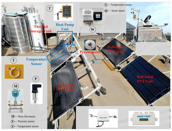 To summarize, this work proposes a single-stage compression PVT heat pump operated with a unique roll-bond unit, with multi-energy generation of heating, cooling, and power. During the transition and winter seasons in Dalian, a continuous experimental study was conducted under natural weather circumstances. To evaluate the proposed system’s potential for use in northern China, particular focus was placed on the heating and electricity co-generation performance. Theoretically, the system’s functioning principles and performance evaluation indicators are presented. The results of the experiment on system co-generation performance and operation features are detailed. In Section 2, the roll-bond-PVT (RB-PVT) and the roll-bond-PVT heat pump (RB-PVTHP) system are presented. The basis of experimental research is covered in Section 3, along with the development of a test platform, a performance evaluation strategy, data reduction, and an error analysis. The experiment’s co-generation performance and operating characteristics throughout the transition and winter seasons are covered in Section 4. Finally, in Section 5, the conclusions are presented.