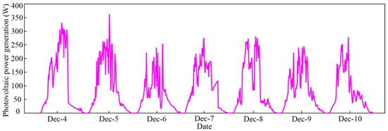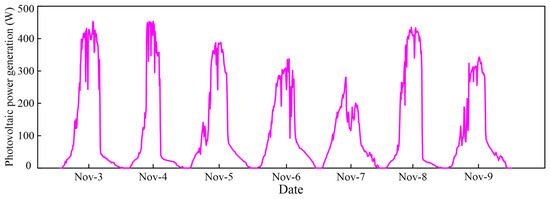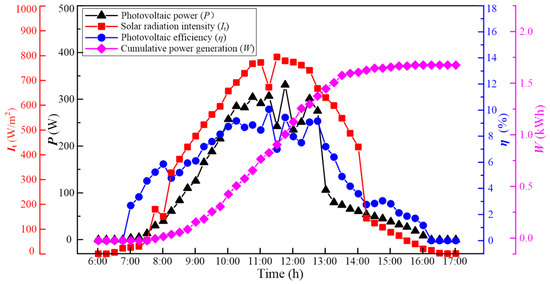 Figure 6 shows the PV power generation during testing. The photovoltaic output fluctuated in response to changes in solar radiation intensity, which followed a parabolic pattern. The duration of daylight was reduced in contrast to summer, resulting in a drop in power generating time. Daytime photovoltaic power peaked at a level comparable to summertime. On cloudy or rainy days, the value was about 300 W and 1.3 kWh, respectively, which showed a substantial decrease from that under sunny conditions. On sunny days, the peak value could reach 450 W, and the cumulative power generation for 1 day was about 1.7 kWh.