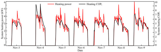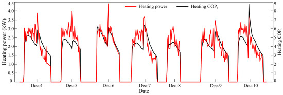 Experimental system’s heating power and heating COPt during the test period for the changing seasons.