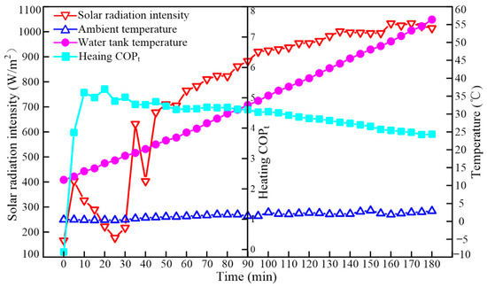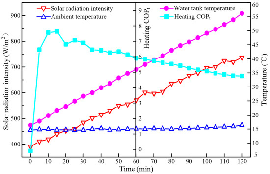 Combined Figure 9 and Figure 10 show the heating performance of the proposed system during a transition period. A typical operation process in the morning was selected and the ambient temperature was about 15 °C, and the solar radiation intensity showed an increasing trend. The 150 L thermal storage tank’s starting water temperature was 16 °C. The water needed roughly 120 min to warm up to a temperature of 56 °C. The average heating power of the system was 3.5 kW, the cumulative heat was 7 kWh (25.1 MJ), and the average COPt was 6. On the whole, this change is mainly influenced by the condensation temperature. The heating COPt could reach the maximum value of 7.8 after 10 min of running. With the running of the system, the water was heated and the condensation temperature increased, causing a reduction in the COPt gradually. However, this process was also accompanied by a rise in the amount of solar radiation; therefore, the system’s heating capacity was high. The compressor only used a small amount of energy, so the COPt drop was likewise minimal.