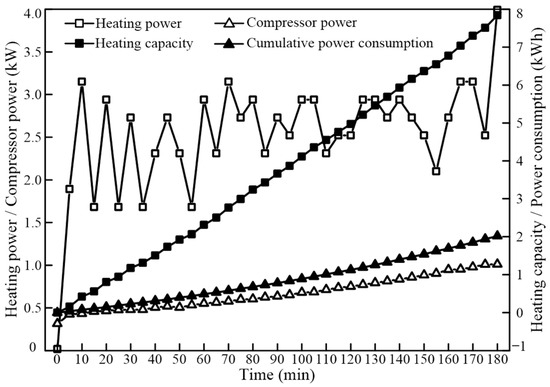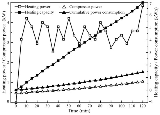 System-heating power, compressor power, heating capacity, and power consumption variation curves during heating process in winter.