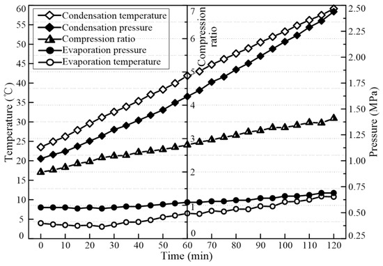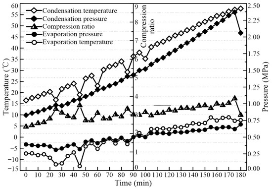 The system compression ratio, evaporation temperature and pressure, and condensation temperature and pressure hourly variation graphs are shown in Figure 11. The evaporation temperature and pressure were constant throughout one heating cycle. The thermal energy absorbed by the PVT unit rose in tandem with the increase in solar radiation intensity, causing the evaporation temperature and pressure to marginally increase with system operation. The average evaporation temperature was 6.5 °C, which was nearly 10 °C lower than the average ambient temperature, making the heat exchange between the PVT unit and the ambient air more favorable. The average evaporation pressure was about 0.6 MPa and the PVT unit worked stably during the whole operation process. The condensation temperature and pressure increased significantly with the system running, which increased from 24 °C to 60 °C. The water temperature was 56.2 °C at the time, and the temperature difference between the interior and outside of the heat exchange coil was 4 °C to 7 °C throughout the process. The condensation pressure steadily rose from 1.0 MPa to 2.4 MPa. Additionally, the compression ratio of the heat pump unit increased gradually throughout system operation, increasing from 2 to 3.61, which was less than that of a typical heat pump system. A high condensation temperature and a low compression ratio helped the RB-PVTHP system run steadily and continuously over an extended period of time.