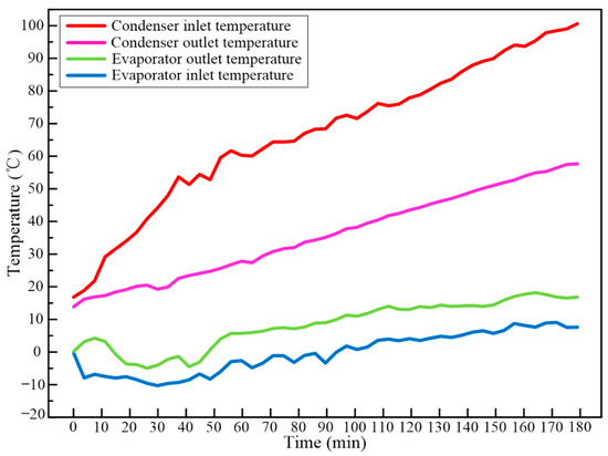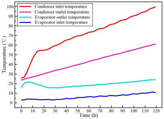 Figure 22 depicts the hourly fluctuation curve of the condenser and evaporator temperature in the winter heating mode. The heat pump unit could operate safely and steadily because the evaporator’s intake and output maintained a superheat temperature of 8 °C to 10 °C. When the system was operating, the condenser’s inlet temperature increased along with the water temperature in the heat storage tank through the coil heat exchanger and the condenser’s outlet temperature. In the first 30 min of the system’s early stage of operation, the condenser’s inlet temperature increased fast; after that, the system’s operation tended to be stable. The condenser’s inlet and outlet temperatures were kept roughly 30 to 35 °C apart.