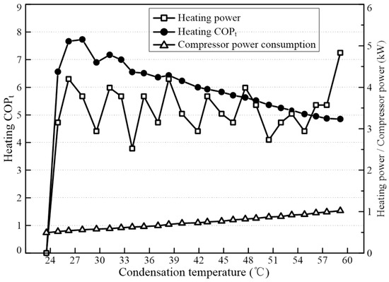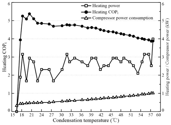 With the increase in condensation temperature, the heating power and COPt decreased gradually as shown in Figure 17. The heating performance was higher at the beginning of the system operation and then decreased with the system running. The experiment operation strategy in the winter season was the same as that in the transition season. The heating performance of the system at mid-day was much better than that in the morning and afternoon, indicating that the solar radiation intensity and ambient temperature were the main factors affecting the system heating performance in winter. The average and maximum values of the system heating power were 2.4 and 4.5 kW, respectively, while the average and maximum values for the heating COPt were, respectively, 4.4 and 8.75.