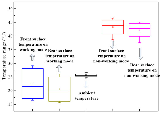 Figure 24 compares the surface temperature distribution of PVT units in working and non-working conditions during the winter. It was decided to use the outside temperature as the reference. According to the aforementioned research, the system’s evaporation temperature was lower than the ambient temperature in the first half of operation, allowing it to collect heat from the air. Meanwhile, it was greater than the ambient temperature in the second half of the operation, which would dissipate heat into the environment. The average surface temperature of the front and the rear surface of the PVT unit was 0.63 °C and −0.19 °C, respectively, which was lower than the average ambient temperature of 1.66 °C. The PVT unit absorbed heat from the environment using convective heat transfer through its surfaces. On the other hand, while the system was not working, the front and rear surface temperature ranges were 22.1 °C to 25.5 °C and 20.0 °C to 25.1 °C separately, with the average value of 23.7 °C and 22.6 °C. The comparison results revealed that the system’s operation in the winter could be caused by the PVT unit’s low surface temperature, which caused dew and frost on the surface, shading the solar cells and reducing power generation. Simultaneously, the surface temperature strayed from the optimal working temperature for solar power generation, reducing photovoltaic performance. The performance of solar power generation in the winter might be improved by adding a thermal insulation layer to the back of the PVT unit and promptly cleaning the dew and frost cover layer from the front of the PVT unit.