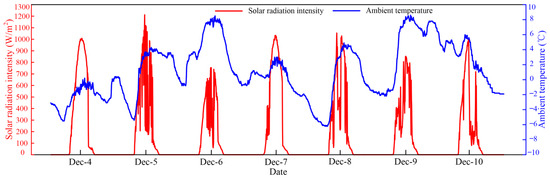 The winter climate in Dalian is characterized by sparse rain and snow, and dry cold with the wind. Due to the long-term control of the cold air mass from Northeast China, the air is dry and the ambient temperature is low. During the experiment period, the ambient temperature was mainly distributed between −8 °C and 8 °C, and the temperature difference between day and night was small. With observation of the meteorological parameters, the test period’s fluctuation trend in meteorological data was compatible with Dalian’s statistical rule for meteorological change through time, and had the typical weather features of the annual values.