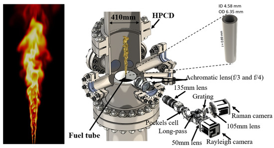 Instantaneous temperature cloud map of CAJF28 (left) and schematic diagram of KAUST jet burner in HPCD (right) [19].