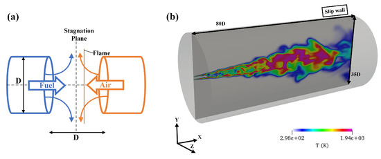 Computational domain and boundary conditions of (a) counterflow flame and (b) jet flame.