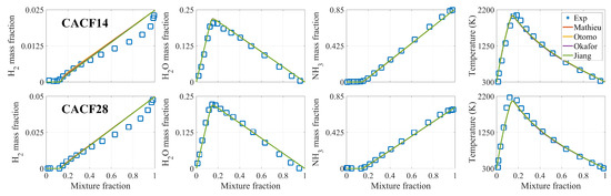 Figure 3 shows the profiles of major species mass fractions and temperature in the mixture fraction space. It can be seen that the predictions of the four mechanisms almost completely overlap. The simulation results for the species mass fractions and temperature match the experimental results quite well. Some minor discrepancies are observed in the fuel-rich region for the mass fraction. This can be attributed to the high mass fraction of at the positions with large mixture fractions, leading to a pronounced preferential diffusion effect.