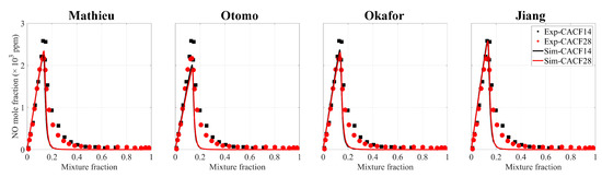 Figure 4 shows the profiles of mole fractions in the mixture fraction space. The predictions generally agree with the experimental results, especially in the fuel-lean side. In the fuel-rich side, the NO mole fraction is under-predicted for all mechanisms. The experimental results show that the peak mole fraction of CACF14 is larger than that of CACF28, so that the Mathieu and Jiang mechanisms, where the peak mole fraction of CACF14 is less than that of CACF28, are excluded for further study. The Okafor mechanism has a peak mole fraction closer to the experimental measurement value under the current unity Lewis number assumption. Therefore, the Okafor mechanism is chosen for subsequent study.