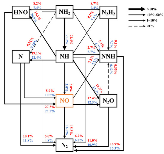 Figure 5 presents the nitrogen flow diagrams of major paths for CACF14 and CACF28. It is worth noting that, for simplicity, the reaction paths in Figure 5 are not complete. As can be seen, the species directly related to formation are , and . Among them, the species that contributes the most to generation is . The second most important species is , while contributes the least to generation. As the cracking ratio increases, the amount of generated through increases, but the amount of generated through species and remains basically unchanged. It can also be seen that is mainly generated through the following four paths: , , and . On the other hand, the products of consumption are , and . As the cracking ratio increases, the amount of directly converted to increases, but the conversion to and remains basically unchanged. is mainly consumed through , , and .