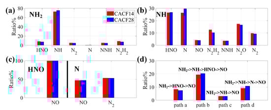 (a) The ratios of converted to nitrogen-containing species in CACF14 (red) and CACF28 (blue); (b) ratios of converted to nitrogen-containing species; (c) ratios of and converted to nitrogen-containing species; (d) conversion rates of generated from via four pathways: a–d.