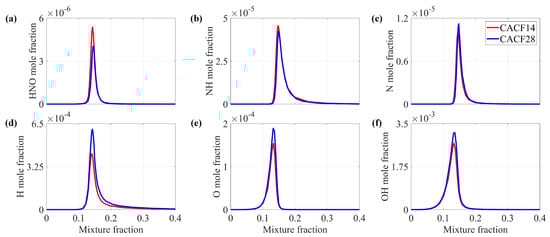 Figure 7 shows the profiles of mole fractions for various radicals in the mixture fraction space. It is seen that the concentrations of and in CACF28 are lower than those in CACF14, which is due to the higher hydrogen concentration and lower concentration related to the higher cracking ratio in CACF28, which further leads to a lower concentration of [20]. According to Figure 5, is an important radical for generation [55]. Therefore, the mole fraction of in CACF28 is lower than that in CACF14, as shown in Figure 4. In addition, it can be seen that the concentrations of radicals such as , and in CACF28 are higher than those in CACF14, which is attributed to the higher concentration associated with the larger cracking ratio, so the reactivity of CACF28 is stronger than that of CACF14.