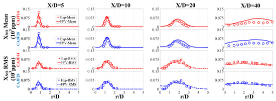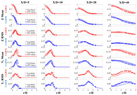 Radial distribution of time-averaged (circle points, solid lines) and RMS values (square points, dashed lines) of at different streamwise locations () for CAJF14 (red) and CAJF28 (blue), as measured in experiments [20] (points) and computed with FPV (lines).