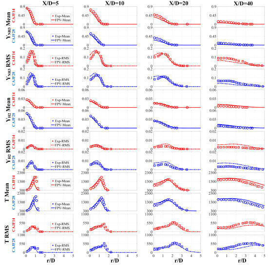In this section, the LES results of the two turbulent flames, i.e., CAJF14 and CAJF28, are compared with the experimental results. Figure 8 shows mean and root-mean-square (RMS) values of the mixture fraction Z and progress variable at various streamwise locations. For the mean values, it can be observed that the simulation results demonstrate a favorable agreement with the measured data across the entire domain. However, the mean of is under-predicted near the peaks in the upstream region , which is more pronounced in the CAJF28 flame with a higher cracking ratio. This is attributed to the more prominent differential diffusion effects near the nozzle region [19,21]. It is evident that at the streamwise locations , turbulent diffusion overtakes molecular diffusion, leading to a good performance of simulations. For the RMS values of the mixture fraction, the peaks initially experience a slight increase along the streamwise direction and subsequently decrease as the flame progresses. It can be observed that for the progress variable, two RMS peaks are observed, corresponding to the lean and rich sides, as shown in the experiments. The RMS peak in the rich side becomes less pronounced with increasing streamwise distance, attributed to the more uniform distribution of jet temperature and composition due to combustion product entrainment. The RMS peak in the lean side gradually increases with the streamwise location.