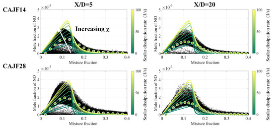 The figure of instantaneous mole fraction (black dots), conditional mean value (green dots) and steady flamelet solutions at different scalar dissipation rates (colored solid lines according to the value of scalar dissipation rate) versus mixture fraction at streamwise locations , for CAJF14 and CAJF28. The arrows point towards the flamelets where the scalar dissipation rate increases.