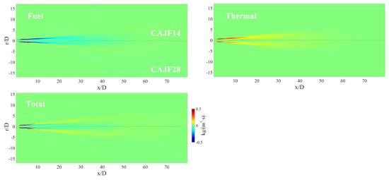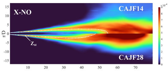 Figure 13 displays the time-averaged distributions of mole fraction for CAJF14 and CAJF28. It can be seen that is primarily observed in a narrow region upstream near the stoichiometric mixture fraction where fuel and oxidizer meet, and a broader region downstream as the jet flame develops. In the downstream region, the peak concentration for CAJF28 occurs at a more upstream location and the peak concentration is higher. This means that when the cracking ratio increases, not only is the flame reactivity enhanced but also the generation of is increased for the turbulent flames. In addition, compared with Figure 4, it can be found that the impact of changes in the ammonia cracking ratio on production seems to be more significant in turbulent flames. This is because in the turbulent jet flame, there are complex interactions between turbulence and the formation of , which might result in a more pronounced difference of formation for the two turbulent flames with different ammonia cracking ratios.