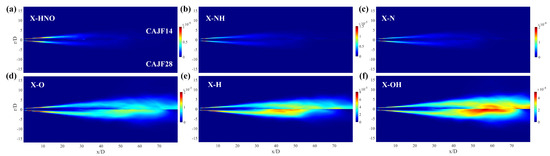 In the analysis of laminar flames, it has been shown that intermediates such as , and are directly associated with generation. Figure 14 shows time-averaged distributions of key species in the turbulent jet flames. As can be seen, in the upstream region of the flames, similar to the laminar flames, a higher cracking ratio results in a lower concentration, which in turn leads to a reduced level. As the streamwise distance increases, the magnitude of nitrogen-containing species concentrations decreases rapidly, indicating that the downstream regions approach the equilibrium state more closely than the upstream regions. Radicals such as are highly indicative of reaction zones and are commonly used to characterize turbulent flames [24], which also play a role in generation in ammonia flames [56,57]. Time-averaged distributions of , and concentrations are presented in Figure 14d–f. It can be observed that in the upstream regions of the flames, similar to the laminar flame results, the higher cracking ratio in CAJF28 results in higher radical concentrations compared to CAJF14. The differences in , and concentrations between the two flames remain distinct in the downstream regions. Furthermore, based on the distributions of radicals, it is concluded that the flame length of CAJF28 is shorter than that of CAJF14. This observation is consistent with the long exposure duration pictures obtained from the experimental results [20], indicating that with increasing cracking ratio, more intense combustion is achieved and the fuel is consumed more rapidly.