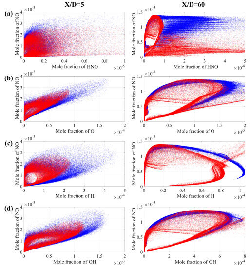 To gain a deeper understanding of formation in turbulent jet flames, two representative locations are chosen for the following analysis, i.e., and 60. From Figure 13, it is evident that these two locations correspond to the regions where the mole fraction peaks. Figure 15 illustrates the scatter plots between important radical concentrations with the concentration at various locations. It is apparent that the correlation between and is weaker when compared to that between and radicals such as , and , both in the upstream and downstream regions. Figure 15b–d indicate that the radicals , and exhibit a positive correlation with , confirming the a role that these radicals play in generation in ammonia flames.