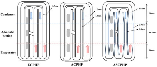 Design diagrams of equal-diameter channel (ECPHP), asymmetric-diameter channel (ACPHP), and adaptive structured channel (ASCPHP) PHPs. The gray shapes represent bubbles, while the blue arrows indicate the direction of condensation flow, and the red arrows denote the direction of evaporation flow.